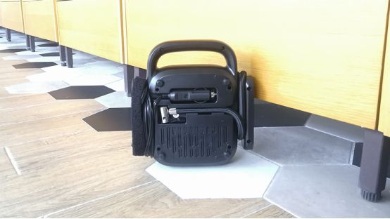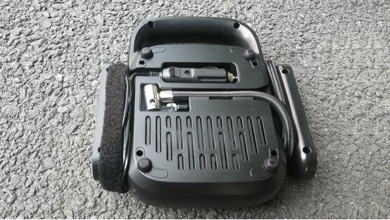 ▲背部专门设计了充气管的收纳凹槽,简单收纳,线机一体,使用时不用花时间找充气管。可以将点烟器插头和充气嘴放进去,并且有一定卡扣原理,放进去以后不容易掉落出来,这里需要注意的是充气嘴收纳的时候是按压下去的,拿出来充气需要给轮胎充气的时候需要扳起卡扣,插入后再按压卡扣即可以进行充电,相比拧螺丝式接口方便很多;