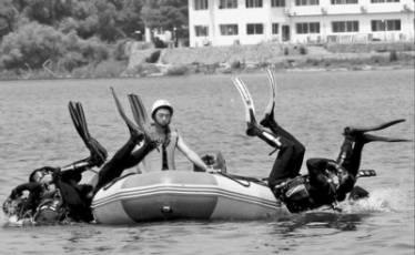 橡胶充气冲锋舟由于船侧是圆柱形,没有可供潜水员拉拽的固定点,上船非常不方便,需要4人以上共同协助潜水员登船。