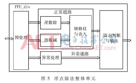 在控制器的控制下,将对级间寄存器中的数据进行浮点除法运算。根据浮点除法运算必需的步骤,设计浮点除法整体单元如图5所示 [7]。本设计由6个部分构成,即预处理、尾数除、指数减、异常处理、规格化与舍入、溢出判断与输出,其中尾数除是通过SRT基4算法 [8]来实现的。