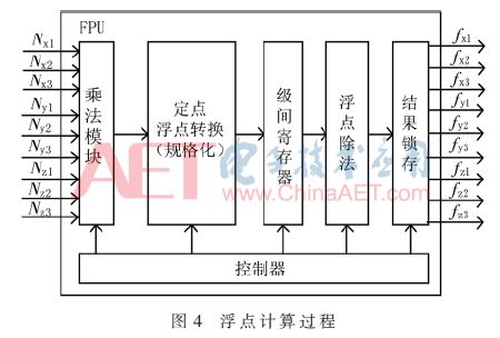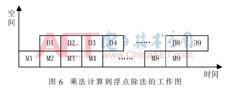 浮点计算是在乘法计算模块到浮点除法模块的过程中使用了流水线结构,当第一通道完成乘法计算后,立即送到下一模块进行相应的数据处理,进而将其送到浮点除法模块做最终计算。同时第二通道在处理其他数据,以此顺序执行运算。