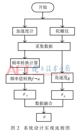 系统设计实现流程图如图2所示,加速度计测量的频率值经过转换得到加速度,再通过姿态解算可得到姿态角θ α,角速度通过积分算出角度θ g,使用互补滤波算法进行数据融合,可得到最终的姿态角θ。