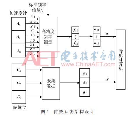 传统的惯性导航系统架构设计如图1所示,首先系统对三个石英振梁加速度计和三个陀螺仪进行数据采集。三个石英振梁加速度计的输出信号和温度信号均为频率信号,每个加速度计输出2路频率信号。根据式(1)可知,要得到加速度,就要测出2个石英梁的频率输出值,则设计的频率采样系统就必须能对9路通道的频率信号进行高精度测量与快速计算。系统对加速度计进行高精度测频,使用的是等精度测频法,其公式为: