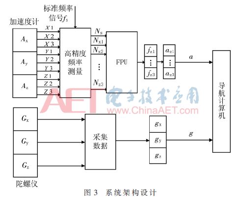 根据式(2),经过频率转换计算得到测频值,然后由式(1)可知,频率值转换后进而得出加速度值。同时三个陀螺仪经过脉冲测量后得到角速度,最后将得到的加速度值和陀螺仪测得的角速度值输入到导航计算机进行后续的解算。