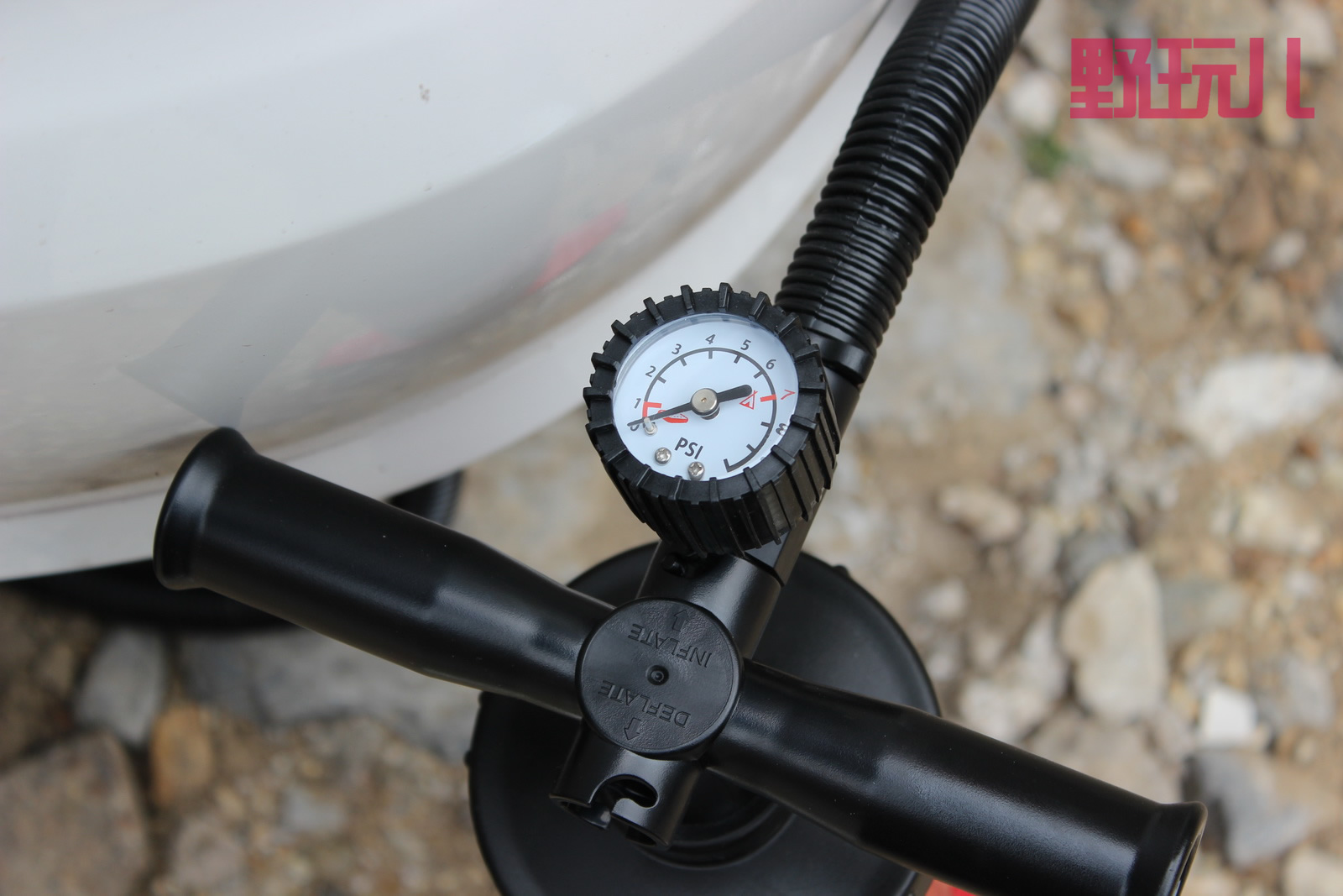 在搭建过程中,我们需要使用到5.2L充气泵。充气泵材质主要是厚实的PVC材质,比较轻便,但尺寸不小。它具备了双向充气、自带压力表、以及快速拆卸安装的导管设计。使得整套产品可以由一个人在5分钟左右的时间快速完成。